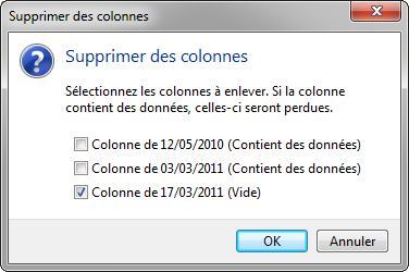 Le deuxième bouton vous permet de supprimer les colonnes d’anamnèse d’une date spécifique. DentAdmin vous demande quelles colonnes vous voulez supprimer et vous signale aussi si la colonne contient des données ou non. Les colonnes vides seront déjà cochées pour vous pour que vous puissiez les supprimer.