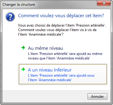 Relâchez le bouton gauche de la souris maintenant au-dessus de l’item Général. DentAdmin vous demande maintenant comment vous voulez déplacer l’item Pression artérielle par rapport à l’item Anamnèse médicale.