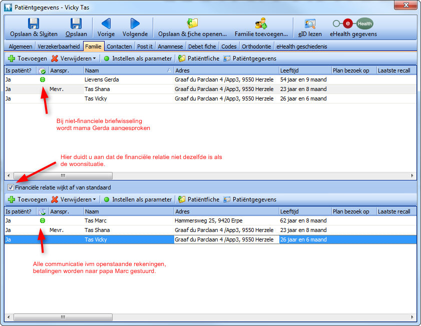 La famille Tas a 2 enfants. Les parents ont divorcé l'an dernier. Les enfants sont restés chez leur mère (Gerda) mais le père (Marc), qui a un emploi bien rémunéré, a promis de supporter tous les frais médicaux. Ici, la situation financière s'écarte de la situation d'habitation. Pour introduire cette situation dans l'écran familial, entrez d'abord la situation d'habitation (s'effectue automatiquement sur base de l'adresse). Indiquez ensuite que la situation financière s'écarte de la situation d'habitation. Un nouvel écran familial s'ouvre: c'est ici que vous rattachez les enfants financièrement au père (Marc).