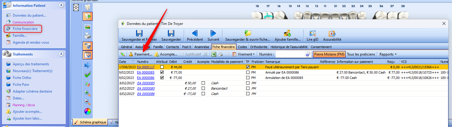 Allez sur la fiche financière du patient et cliquez sur paiement :