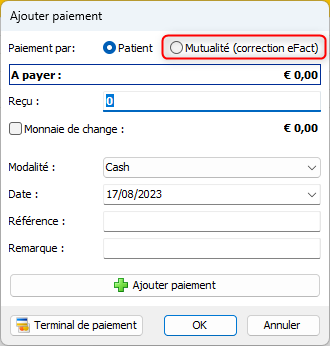 C'est ainsi que vous indiquez qu'il s'agit d'un paiement de correction de la mutualité, et non d'un paiement du patient.