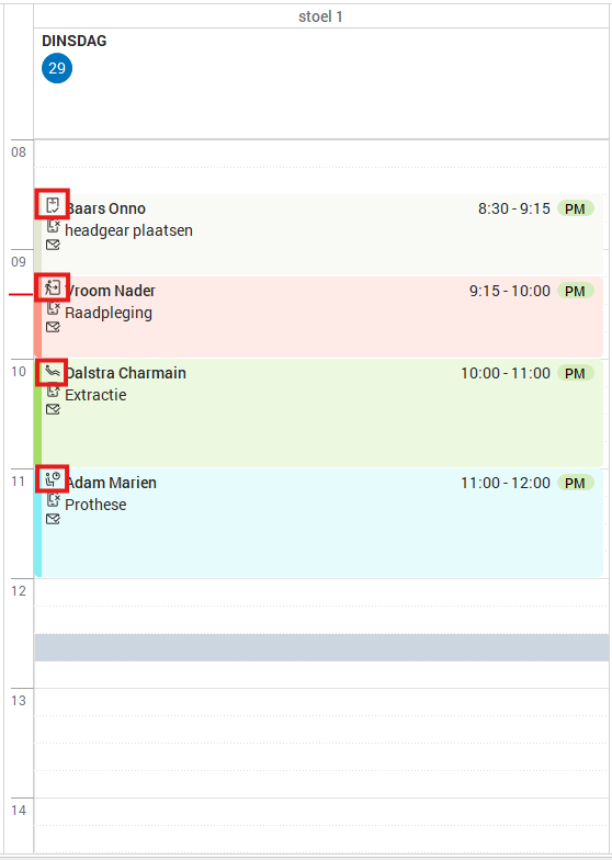 Dans l’agenda, à gauche de chaque patient, des icônes sont affichées pour indiquer le statut actuel du rendez-vous du patient. De haut en bas, dans l’image ci-dessous : Terminé, Prêt à facturer, Dans le fauteuil, Présent.