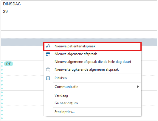 Ensuite, cliquez avec le bouton droit dans l’agenda sur le jour et l’heure souhaités, puis sélectionnez « Nouveau rendez-vous patient ». Vous pouvez aussi double-cliquer pour ouvrir la fenêtre de rendez-vous.