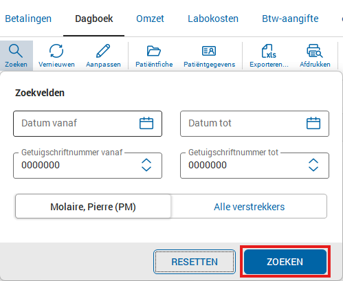 Dans l’écran de recherche, vous pouvez indiquer la ou les dates pour lesquelles vous souhaitez consulter les paiements. Vous pouvez également choisir de demander les données pour un seul prestataire, à savoir celui qui est connecté, ou pour tous les prestataires. Si vous souhaitez consulter les paiements d’un prestataire spécifique, vous devez d’abord vous connecter avec le profil prestataire approprié. Confirmez ensuite votre sélection en cliquant sur le bouton « Rechercher ».