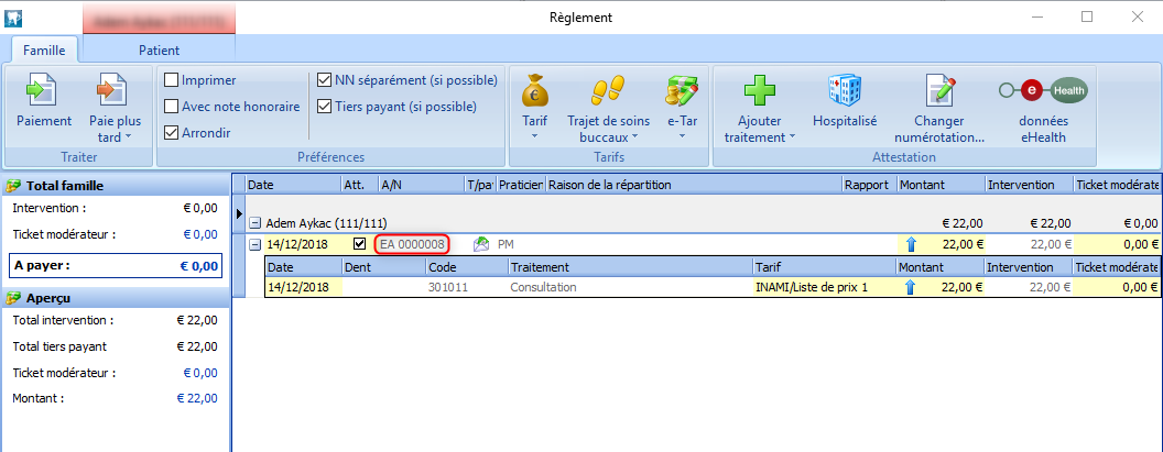 - Cliquez sur le bouton Paiement pour enregistrer le paiement. Au même moment, l’attestation électronique sera créée. Un document justificatif sera imprimé pour le patient et sauvegardé automatiquement à partir de la fiche patient. Ce document justificatif remplace aussi bien l’attestation, le document justificatif RTP que le document justificatif attestant la facturation simultanée de nomenclature INAMI et de prestations non remboursables. Aucune attestation n’est plus imprimée. Tout cela cadre dans la simplification administrative.
