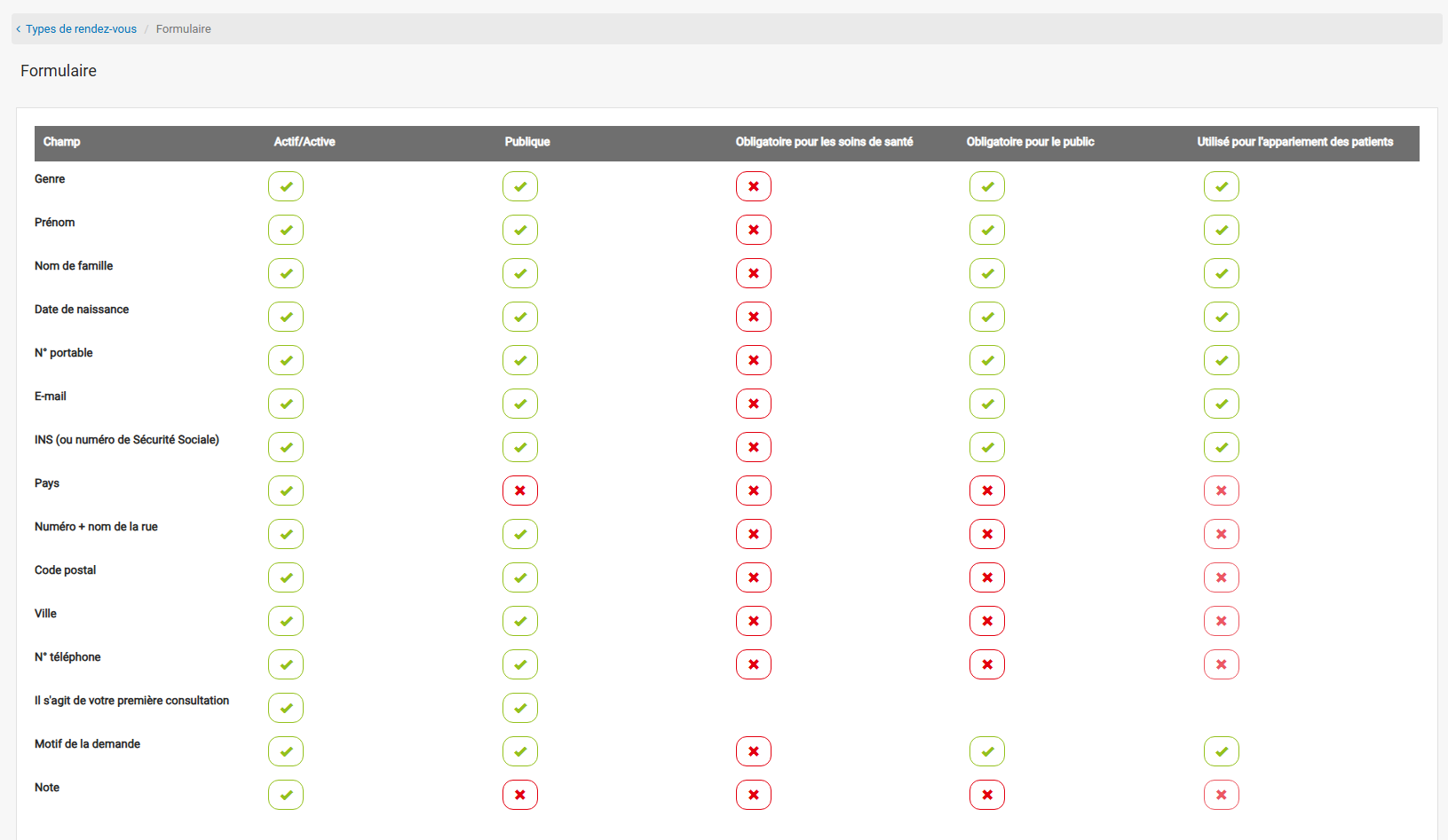 - Public : ce sont tous les champs dont vous voulez qu’ils soient actifs pour les patients.