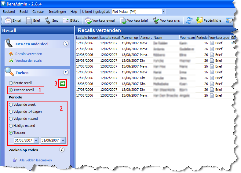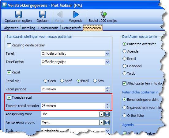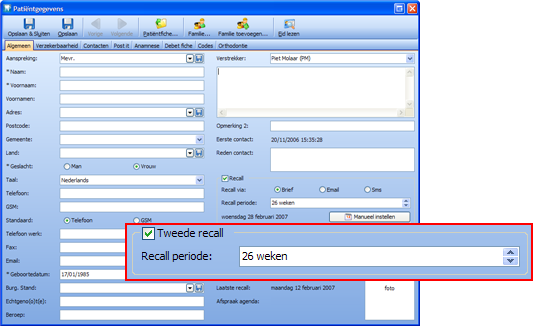 Door op een van de knoppen E-mail, Brief of Sms te klikken, kan je een respectievelijk bericht openen en versturen naar de patiënt. In het patiëntgegevensscherm kunt u instellen of een patiënt een tweede recall moeten krijgen en na welke periode.