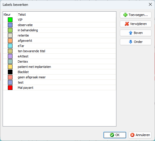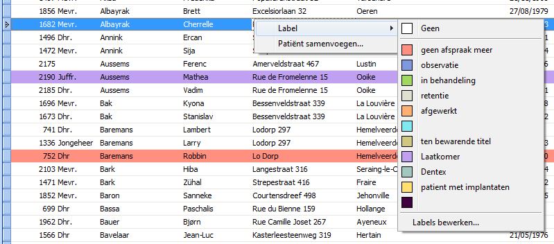 In het patiëntenoverzicht kan u rechtsklikken op een patiëntennaam en bij label een welbepaald label kiezen. Via Labels bewerken kan u zelf de betekenis van elke kleur aanpassen en nieuwe labels aanmaken.