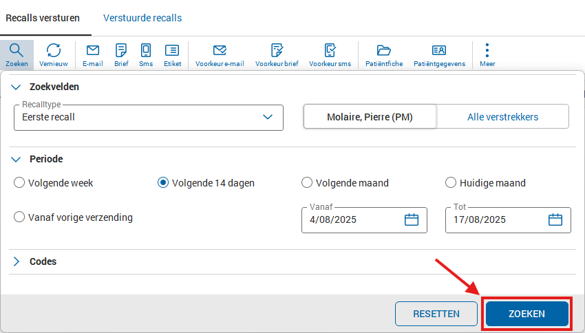 Om de gewenste patiënten te selecteren om de recalls naar te versturen, klikt u op 'Zoeken' in het venster van de recalls.