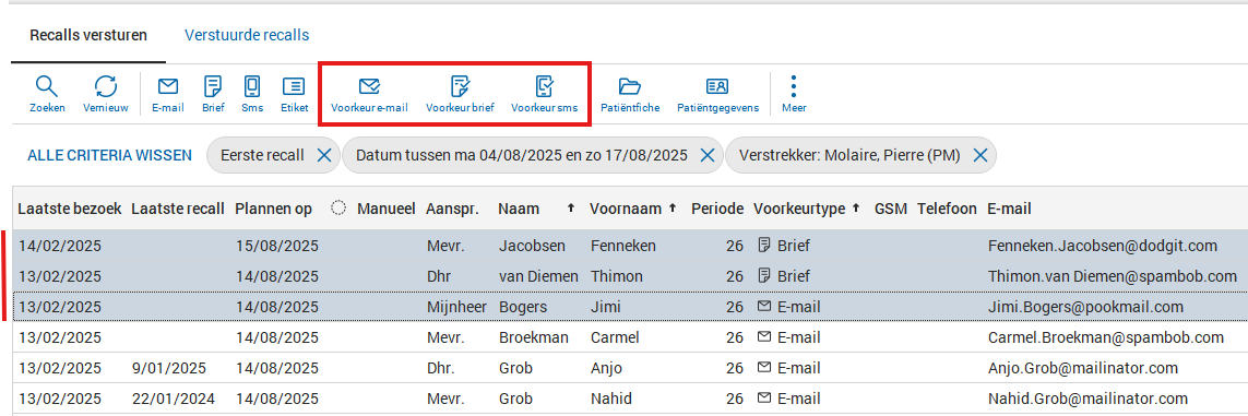 Alle patiënten die onder de geselecteerde criteria vallen worden in de lijst weergegeven. Om een recall te versturen, kunt u linksboven kiezen uit het versturen van een e-mail, brief of SMS. Let er wel op dat de nodige contactgegevens correct zijn ingevuld in de patiëntfiche voor het verzenden van e-mails en SMS'en. Vervolgens kunt u het gewenste sjabloon uit uw lijst kiezen en verzenden.