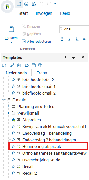 In het venster van de e-mails kan u het gewenste te versturen sjabloon selecteren, in dit geval 'Herinnering afspraak'.