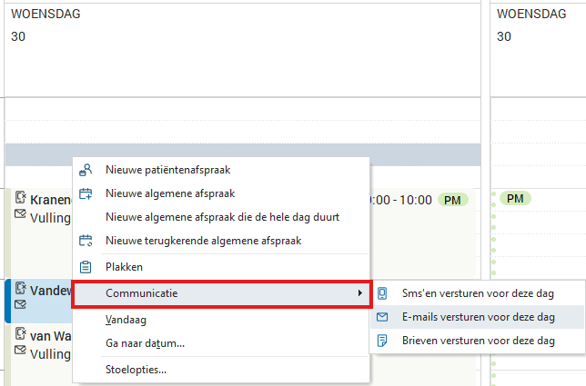 Klik met de rechtermuisknop in de agenda op de gewenste dag waarop u herinneringen wilt versturen. Let erop dat u een dag selecteert waarop patiënten zijn ingepland. Selecteer 'Communicatie' en kies vervolgens voor SMS'en, e-mails of brieven.