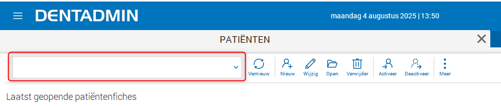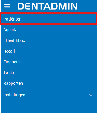 Om een patiënt op te zoeken in de vernieuwde versie van DentAdmin starten we net zoals in de oude versie in het patiëntenoverzicht. We navigeren hiernaartoe via het 'hamburgermenu' (de drie lijntjes linksbovenaan) en klikken vervolgens op de knop 'Patiënten'.