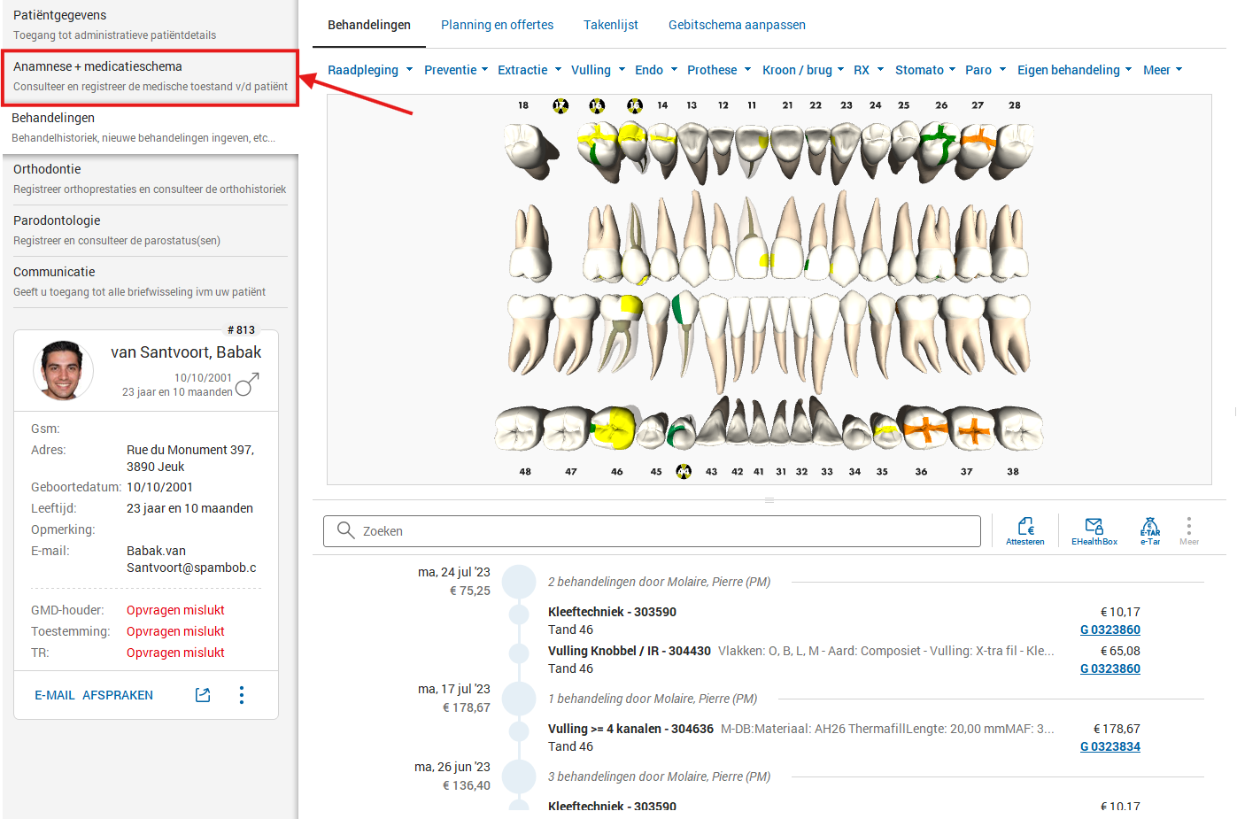 Vervolgens ziet u links van het gebitschema de optie ‘Anamnese + medicatieschema’. Selecteer deze optie.