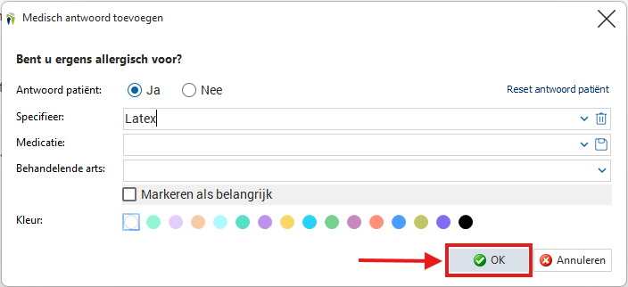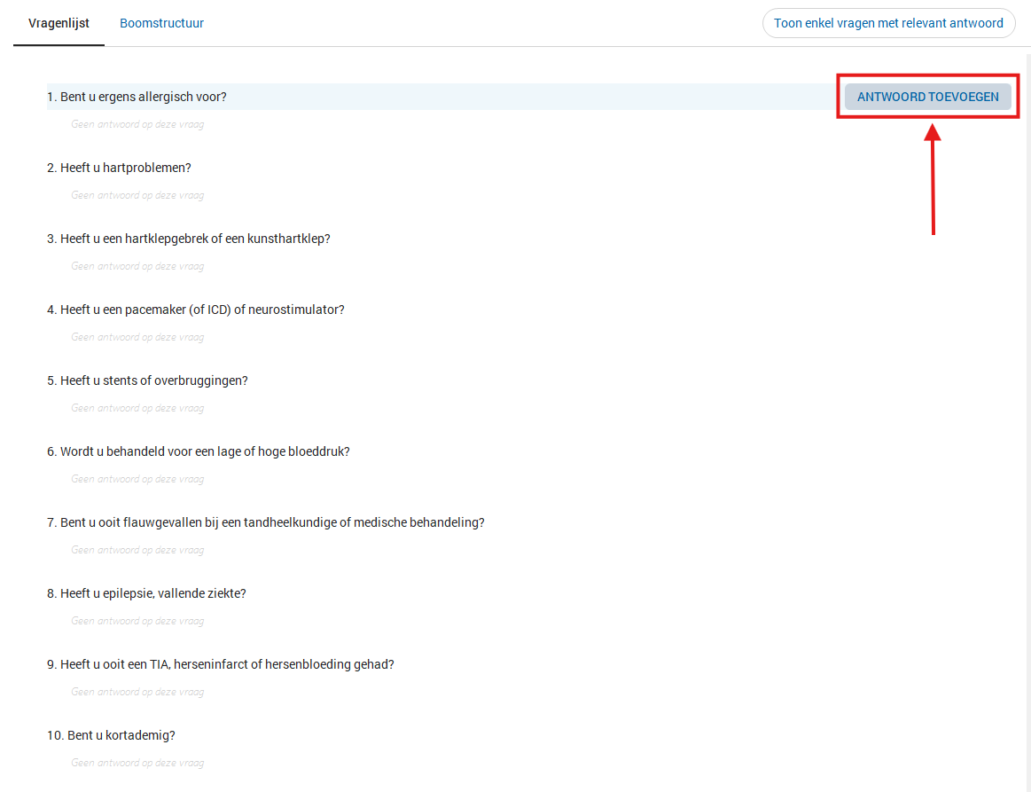 Wanneer u in de anamneselijst op een vraag gaat staan, verschijnt er een knop om een antwoord toe te voegen. Selecteer deze knop.