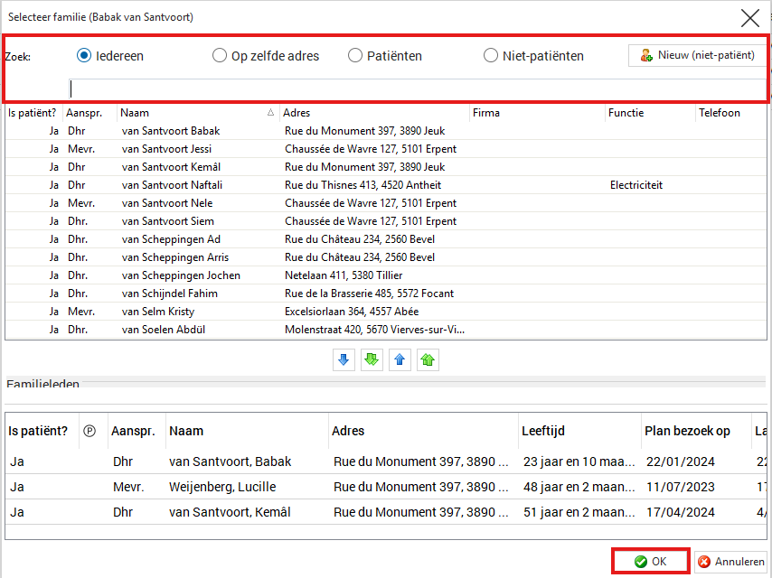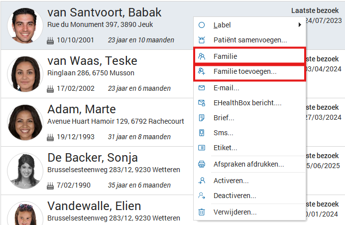 Om een familielid toe te voegen aan een bestaande patiënt, vertrekt u vanuit het patiëntenoverzicht.