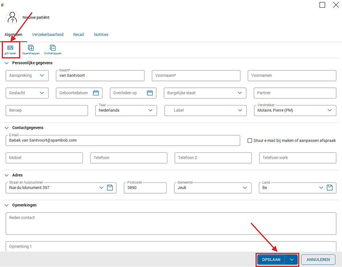 Hier kunt u met de knop linksboven een nieuwe patiënt toevoegen door de eID-kaart in te lezen. Vergeet nadien niet te bevestigen met ‘Opslaan’.