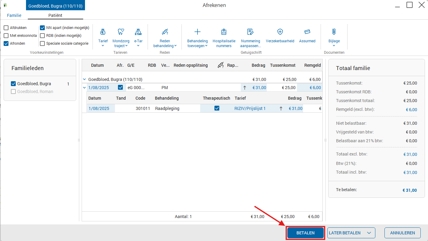 Vervolgens zal het reeds gekende venster voor het afrekenen openen. Kijk de gegevens na en bevestig met 'Betalen'.