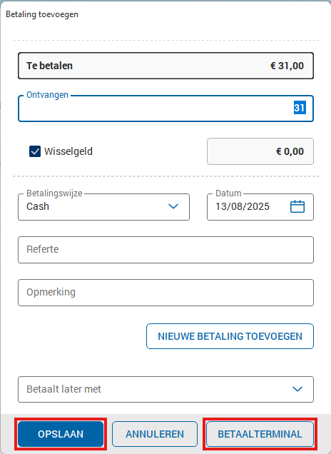 Hierna kan u de gewenste betaalmethode selecteren en bevestigen met 'Opslaan' of 'Betaalterminal' indien de patiënt met bancontact zal betalen.