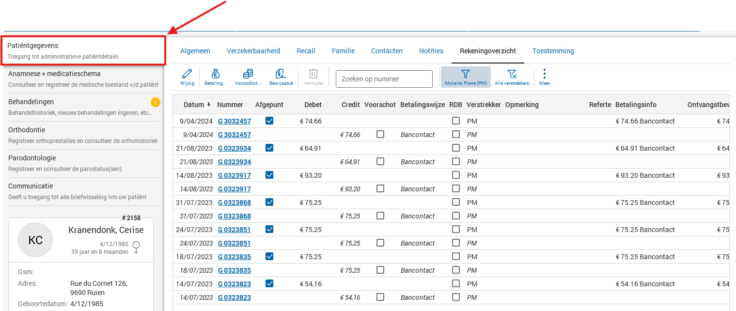 Om een bewijsstuk af te drukken, gaat u eerst naar de fiche van de patiënt. In dat scherm klikt u vervolgens op 'Patiëntgegevens'.