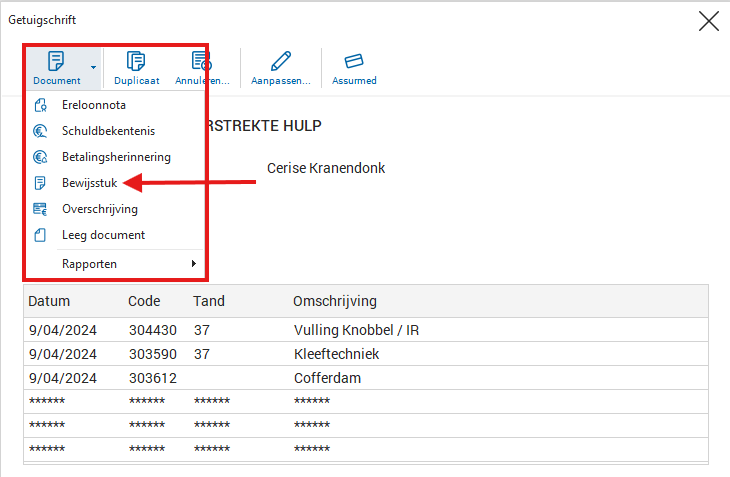 Om een bewijsstuk af te drukken, selecteert u het gewenste attest van de uitgevoerde behandeling.