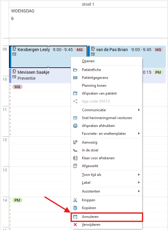 Indien een afspraak om een bepaalde reden geannuleerd moet worden, vertrekt u vanuit de agenda. Zodra u zich in de agenda bevindt, navigeert u naar de betreffende afspraak en klikt u hier met de rechtermuisknop op. Vervolgens klikt u op 'Annuleren'.