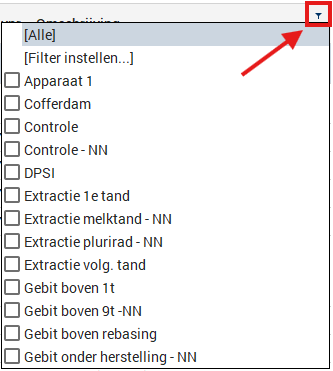 U kunt de behandelingen niet alleen sorteren per categorie, maar ook op behandeldatum, nomenclatuurcode, RIZIV-nummer, omschrijving, verstrekker, bedrag, datum en nummer van het getuigschrift, patiënt, tand, officiële prijs, tussenkomst en labo. Hiervoor begeeft u zich naar de gewenste categorie en klikt u op het filter-icoontje.