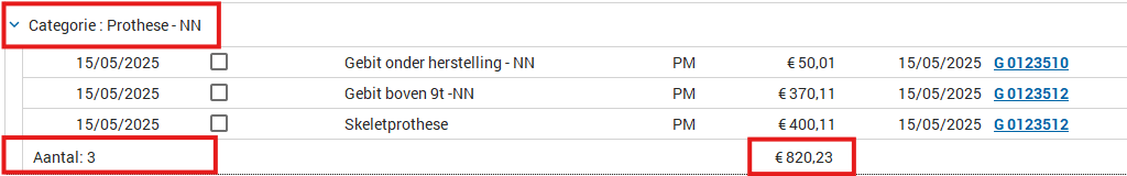 Alle uitgevoerde behandelingen zijn standaard per categorie gegroepeerd. Wanneer u een categorie openklapt, ziet u onderaan het aantal behandelingen binnen die categorie, alsook het totale bedrag dat deze behandelingen hebben opgebracht.