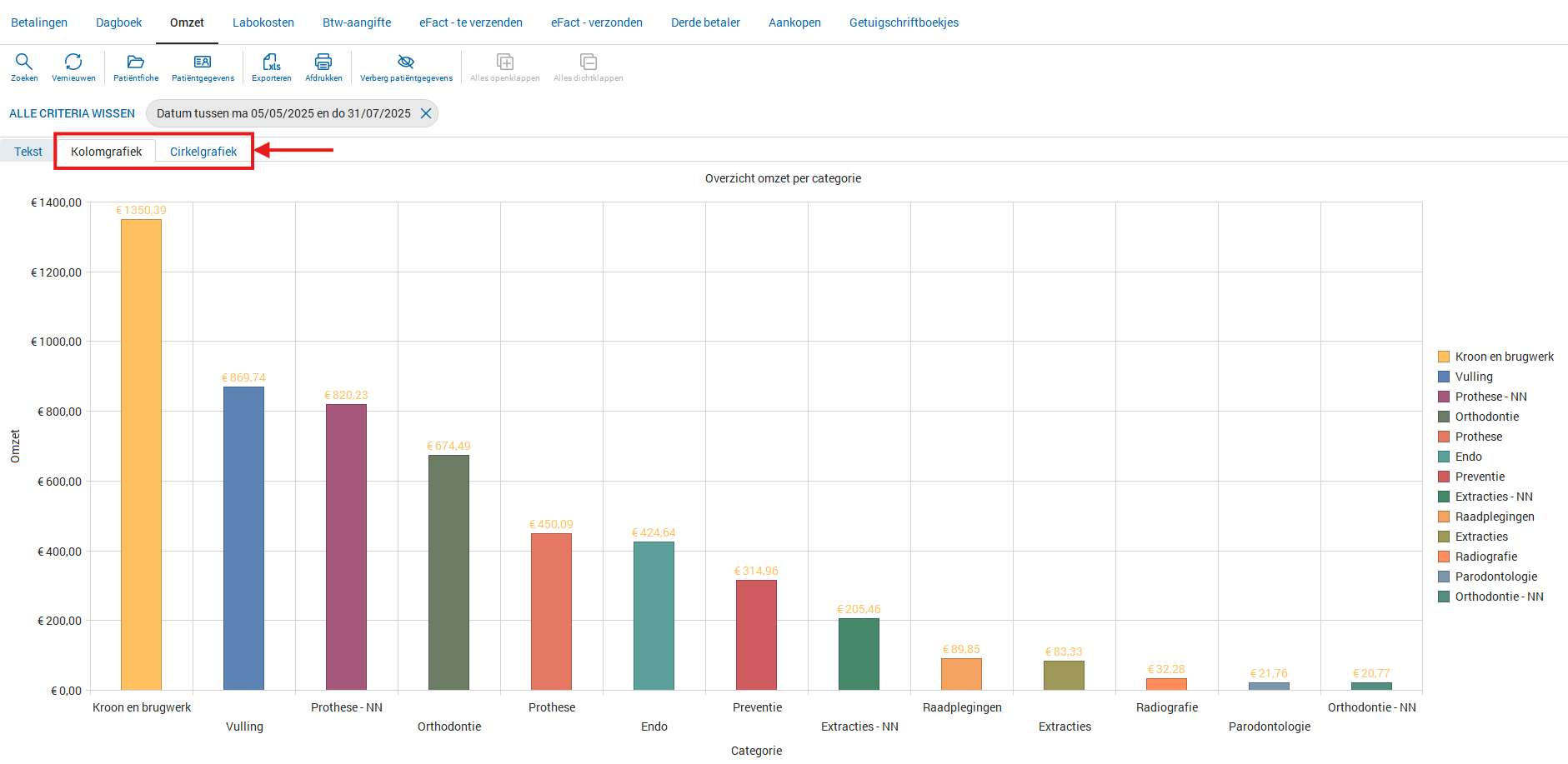Het is ook mogelijk om de gegevens per categorie grafisch weer te geven. Hiervoor kan u één van de beschikbare opties boven de tekstuele gegevens selecteren: 'Kolomgrafiek' of 'Cirkelgrafiek'.