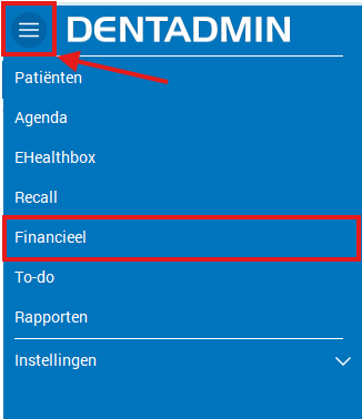 Wij raden aan om dagelijks aan het einde van de dag de eFact-zendingen naar de mutualiteiten te versturen. Zo voorkomt u dat het programma vastloopt door een opstapeling van te veel zendingen. Hiervoor gaat u naar het hamburgermenu links bovenaan en klikt u op 'Financieel'.