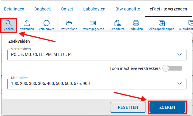 Onder de optie 'Zoeken' kunt u de gewenste verstrekker(s) aanduiden en de mutualiteit selecteren waarvoor u de eFact-zendingen wilt versturen.