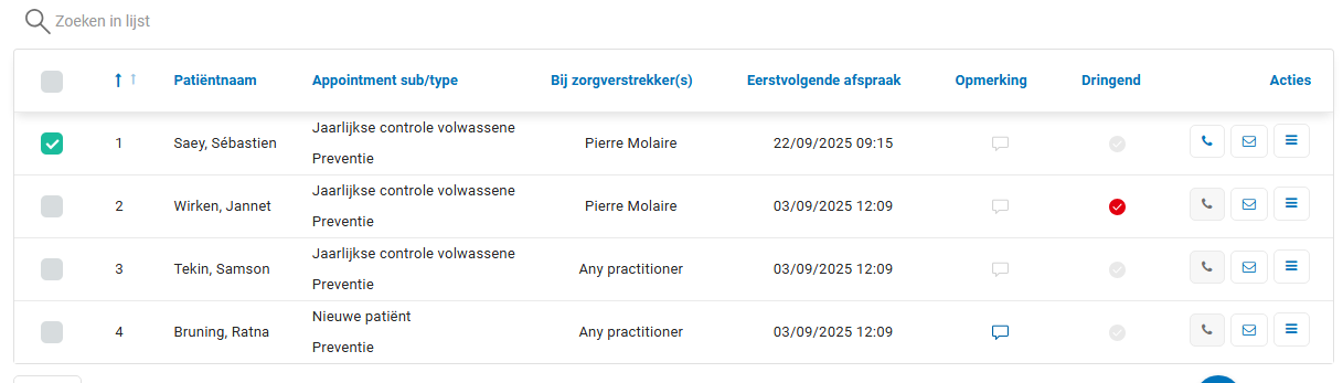 - In de patiëntenlijst kunt u de volgorde handmatig aanpassen door onder Acties uw muis over de streepjes te zweven en dan te slepen.
