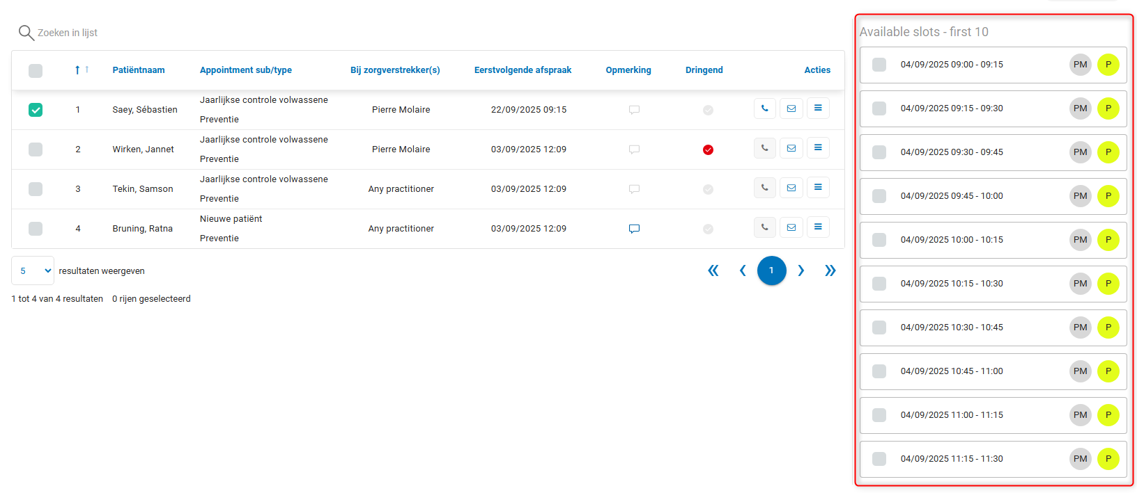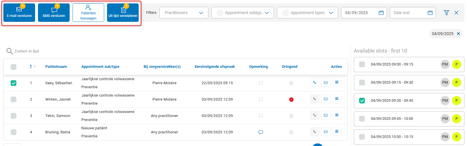 - Daarna duidt u aan de rechterkant aan welke afspraken u wilt sturen. In dit voorbeeld zijn er nog heel veel plaatsen vrij op 04/09, maar in de realiteit bij jullie in het kabinet zal dit veel minder zijn natuurlijk.