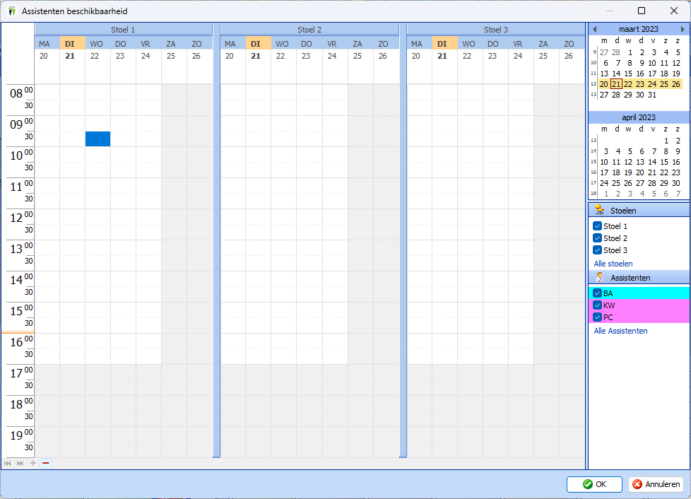 Als er een afspraak gemaakt wordt, is de op dat moment op die stoel ingeplande assistent(e) zichtbaar bij het maken van de afspraak:Het is niet meer nodig om manueel nog een assistent(e) aan te duiden, dit gebeurt automatisch.